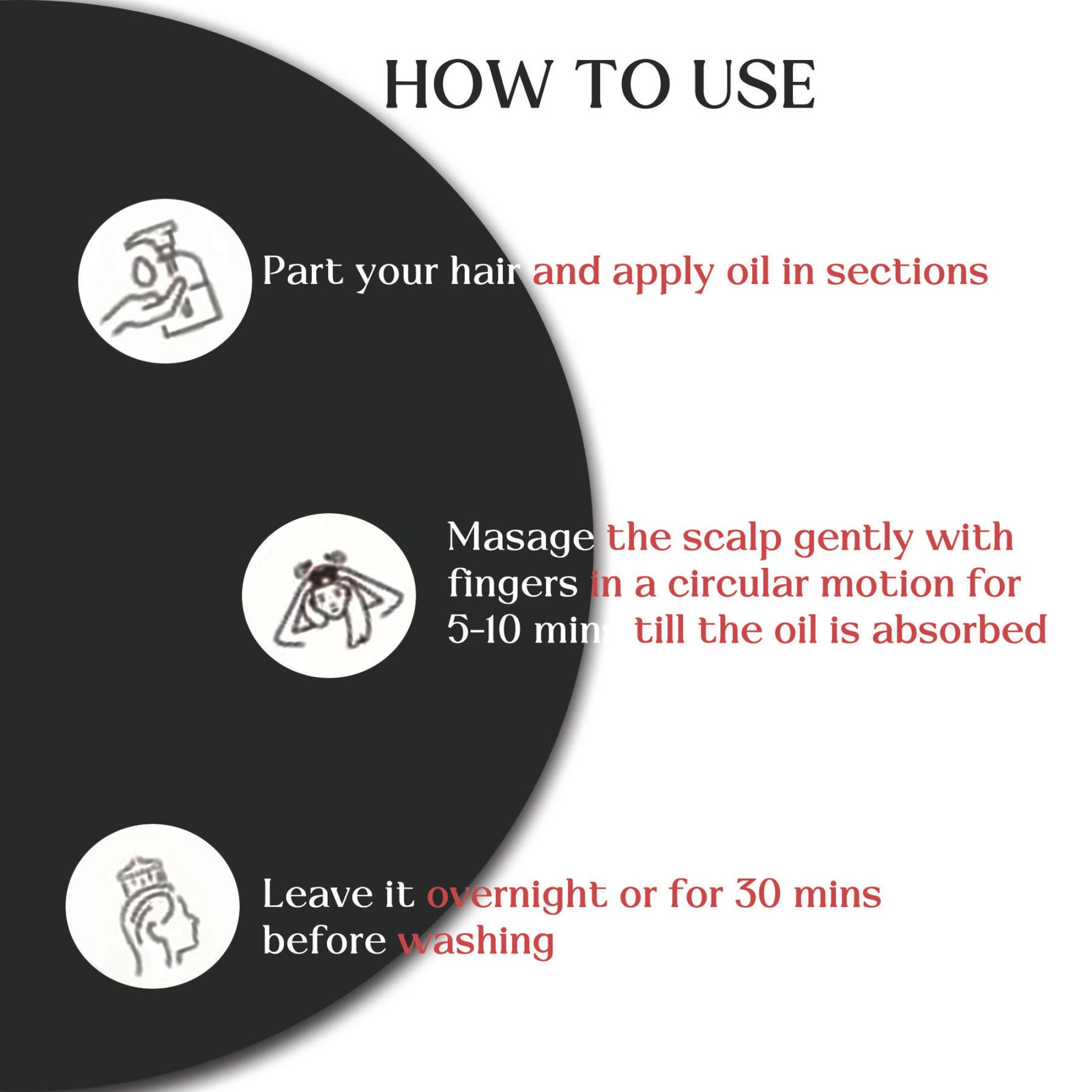 A5 : Warm a few drops between your palms, massage into the scalp, and apply along the lengths of your hair. Leave for 30 minutes or overnight for best results.